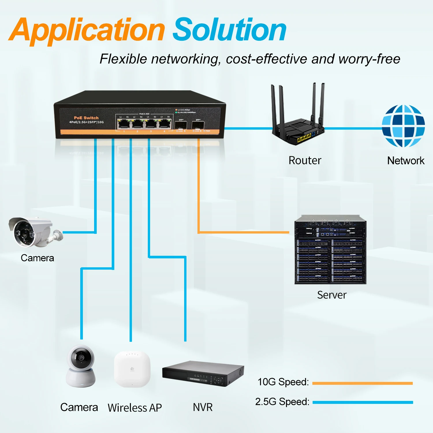 El conmutador Ethernet POE K0402WB es un conmutador que proporciona 4 puertos PoE de 2,5G y 2 puertos ópticos SFP + de 10G. Cumple con los estándares 802. 3AF/AT con una potencia máxima de 75W. Permite la transmisión directa de alta velocidad de varios dispositivos 2,5G, utilizando un mecanismo de almacenamiento y reenvío con caché de alta capacidad integrado para reducir eficazmente la latencia de reenvío de datos. Todos los puertos admiten reenvío de velocidad de línea sin bloqueo.