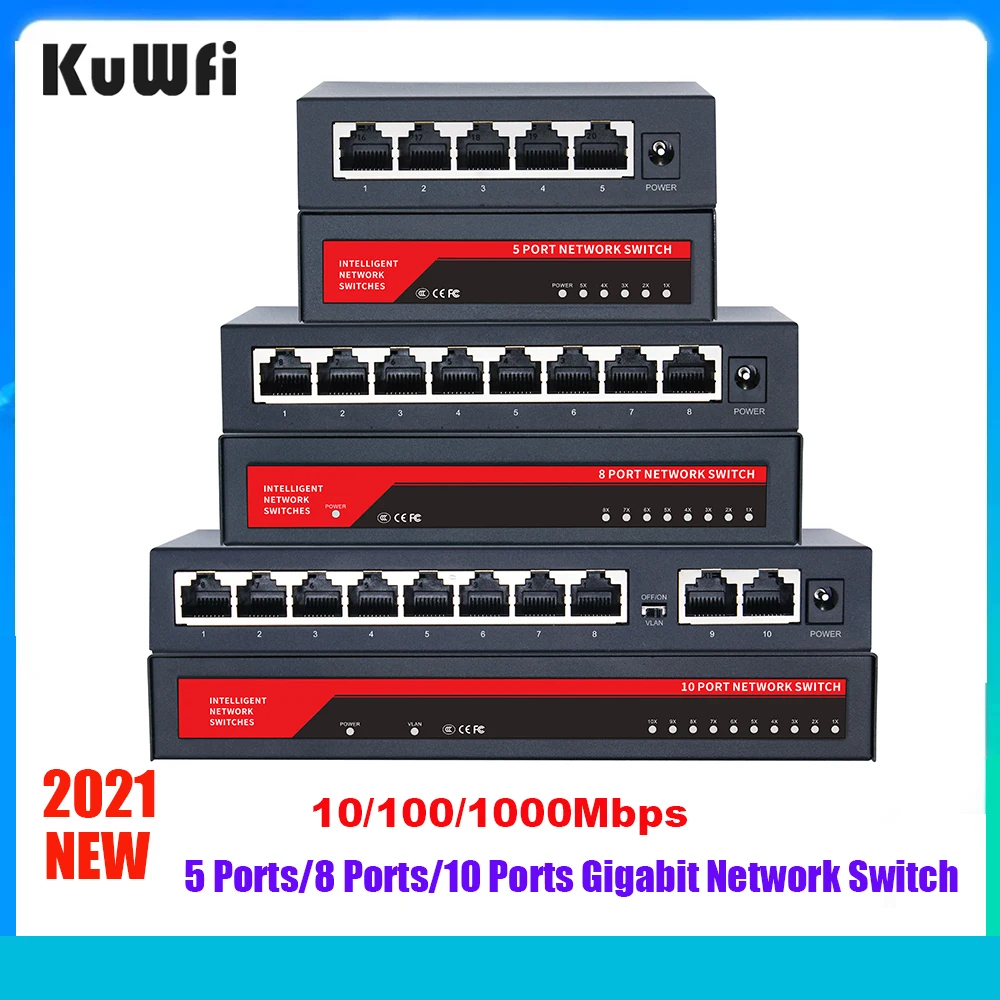 Comprar Conmutador de red Gigabit KuWFi, conmutador Ethernet de 1000Mbps, concentrador LAN RJ45 de 5/8/10 puertos, interruptor rápido de escritorio para oficina, dormitorio y hogar