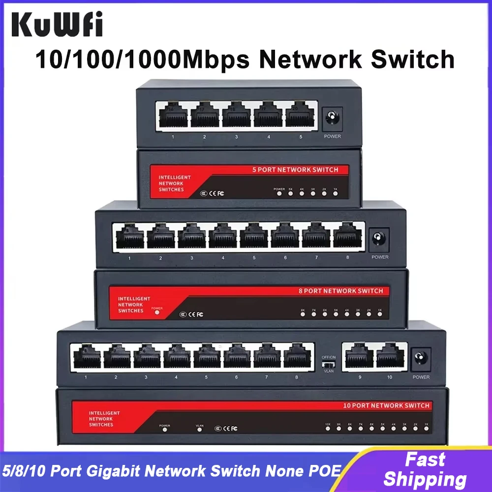 Comprar Conmutador de red Gigabit KuWFi, conmutador Ethernet de 1000Mbps, concentrador LAN RJ45 de 5/8/10 puertos, interruptor rápido de escritorio para oficina, dormitorio y hogar