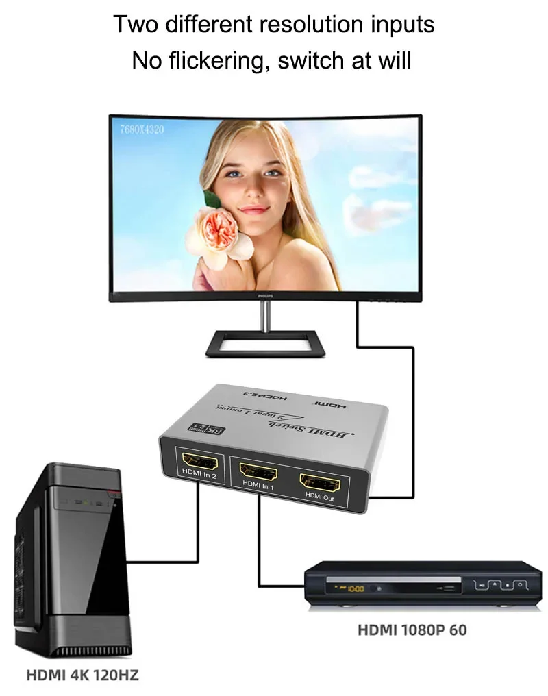 Conmutador 8K HDMI 2x1: admite resolución de hasta 8K @ 60Hz 4K @ 120HZ, proporciona velocidades de transferencia de hasta 48Gbps