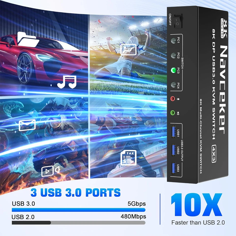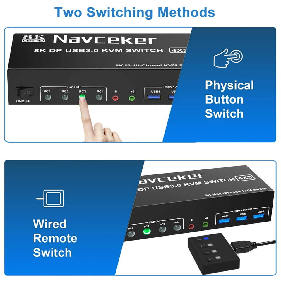 El conmutador KVM Navceker 8K 60Hz 4x3 Displayport USB 3,0 le permite compartir un teclado USB, un ratón USB y tres monitores DP para controlar 4 ordenadores, portátiles y consolas de juegos.