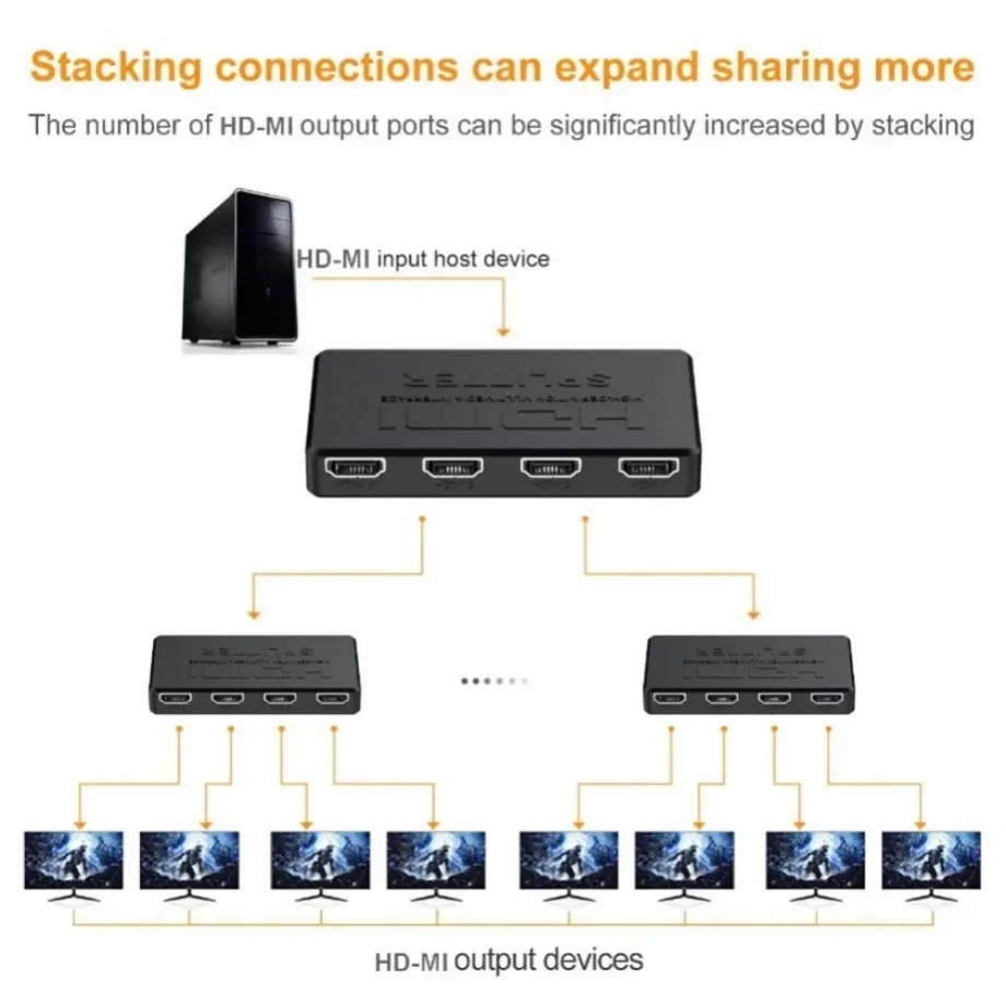 ● Divisor HDMI 1 en 4 salidas, de modo que un puerto HDMI para asignar cuatro puertos HDMI distribuidor de audio y video de alta definición.