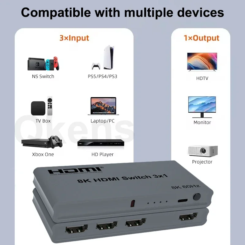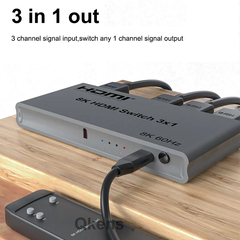 Este conmutador HDMI 8K 3x1 permite cambiar 3 puertos HDMI a un único terminal de pantalla a través de un control remoto