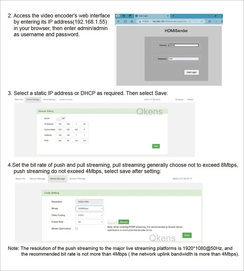 Resolución de entrada SDI......................................................................... Hasta 1080P@60Hz Velocidad de transmisión SDI................................................................................. hasta 2,97 Gbps Longitud del cable de entrada SDI..................... Máximo 100 metros, utilizando cable de vídeo digital RG6 75R HD Resolución de entrada HDMI.................................................................................. 1080P@60Hz Resolución de salida HDMI.................................................................................. 1080P@60Hz Codificador de vídeo Protocolos de transmisión Ethernet (RJ45) para transmisión push/pull... RTMP/RTSP Velocidad de bits del codificador de vídeo......................................................................... Máx.8Mbps Codificador de vídeo Resolución de transmisión Push/Pull................................ 1920*1080@50Hz Puerto LAN.................................................................................................. 10/100M Admite formato de codificación de codificador de video................................................. H.264/H.265 Codificación de audio del codificador de vídeo......................................................... AAC, 48KHz Admite la dirección IP de la pantalla OSD.....................................................Predeterminado: 192.168,1.55 Admite formato de audio................................................................................................. PCM La transmisión máxima de ancho de banda............................................148,5MHz Velocidad máxima de transmisión................................................................ 1,65 x3 Gbps La longitud del cable de entrada................................ 1080P/60Hz≤15 m Cable estándar HDMI AWG26 La longitud del cable de salida................................ 1080P/60Hz≤15 m Cable estándar HDMI AWG26 Corriente máxima de trabajo................................................................................ 0,85 A Especificaciones del adaptador de corriente..........Entrada CA (50 Hz, 60 Hz) 100 V-240 V; Salida: CC/12 V 2 A Rango de temperatura de trabajo................................................................. (-15℃ a +55℃) Tamaño......................................................................................Aprox.180x135x52(mm) Peso.................................................................................. .Aprox.550 gramos