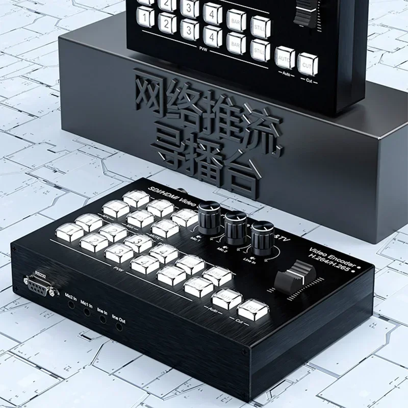 * Conmutación de 4 cámaras, admite salidas duales PGM/PVW, transiciones perfectas, Efectos de desvanecimiento/desvanecimiento, y más. * 1 entrada de señal SDI admite una resolución de 1920*1080/60hz y admite transmisión sin pérdidas de 100 m; * Convierte fácilmente señales SDI de nivel de transmisión; * 3 entradas HDMI; 2 salidas HDMI; * 1 puerto RJ45 Gigabit Ethernet compatible con protocolos RTMP/RTSP; * Codificador de hardware incorporado, admite codificación H.264/H.265; * Admite señal del canal de entrada de pantalla OSD, información de resolución, información de volumen; Visualización de la dirección IP del codificador de video (predeterminado: 192.168,1,55); * Admite salida de mezcla MIC,LINE IN,HD (salida de mezcla fija LINE OUT); * Admite seguimiento de audio HD (pgm seguimiento fijo); * Admite salida de audio LINE OUT y HD; * Admite configuración de guardado de apagado; * Teclas de alta calidad, diseño de retroiluminación de color.