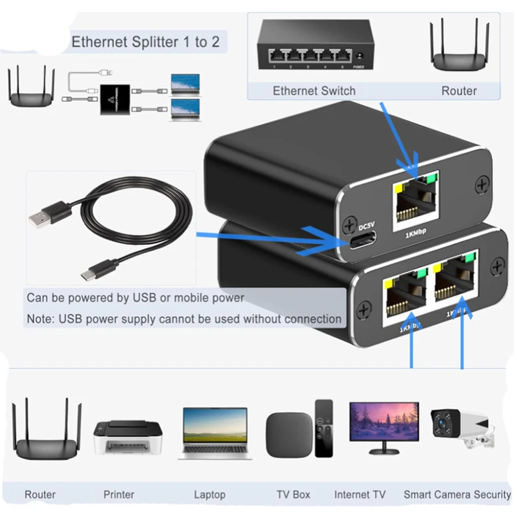 Amplia compatibilidad y portabilidad: compatible con múltiples cables Ethernet, adecuado para varios dispositivos, elegante y compacto, fácil de transportar, requiere conexión de alimentación para funcionar, admite el uso simultáneo de dos conectores hembra