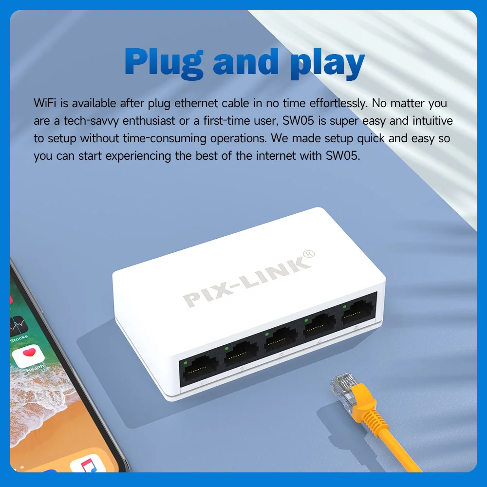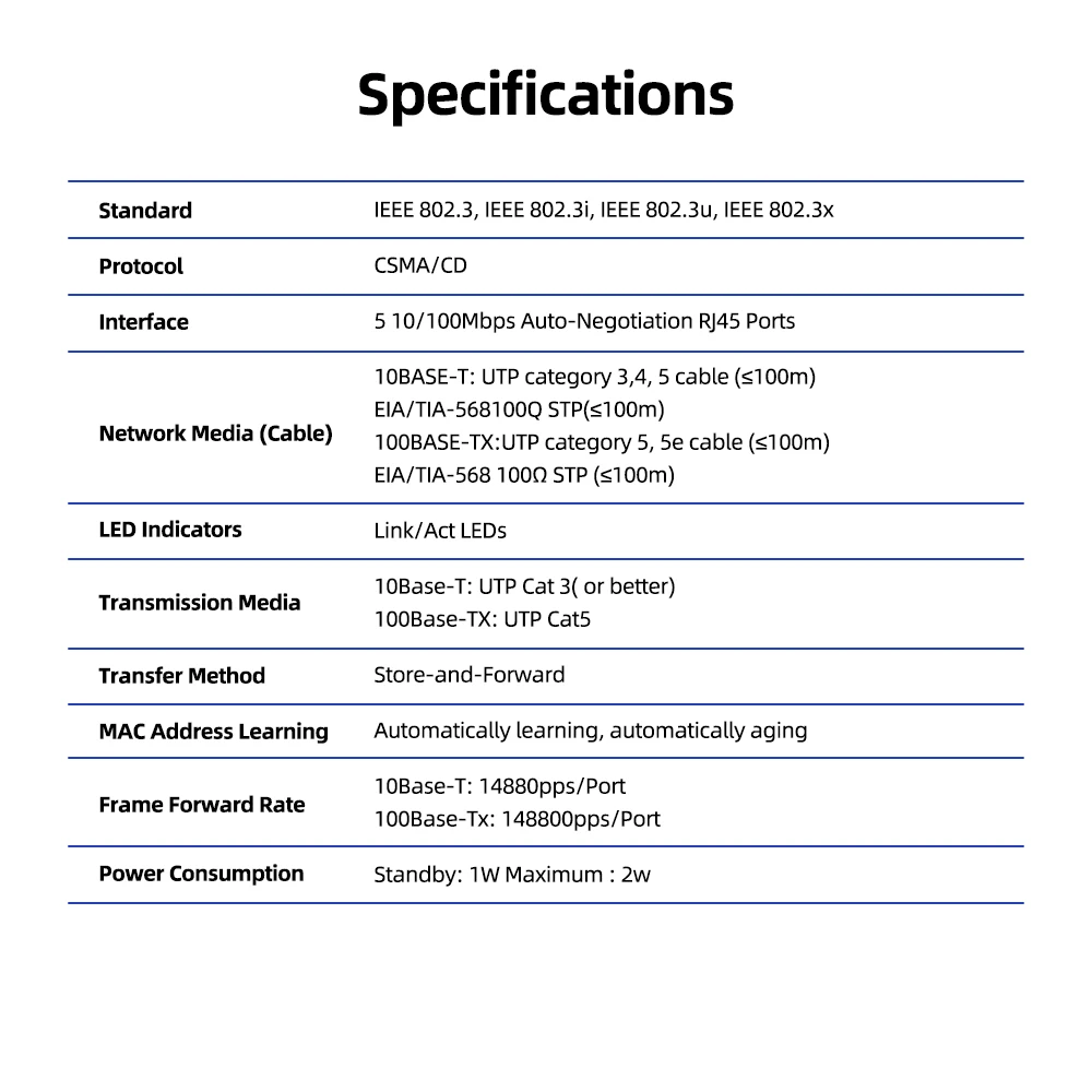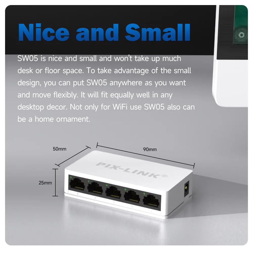 • Diseño mini ethernet 5 port :Su diseño mini ethernet de 5 puertos facilita su instalación y aplicación en cualquier entorno de oficina o hogar.