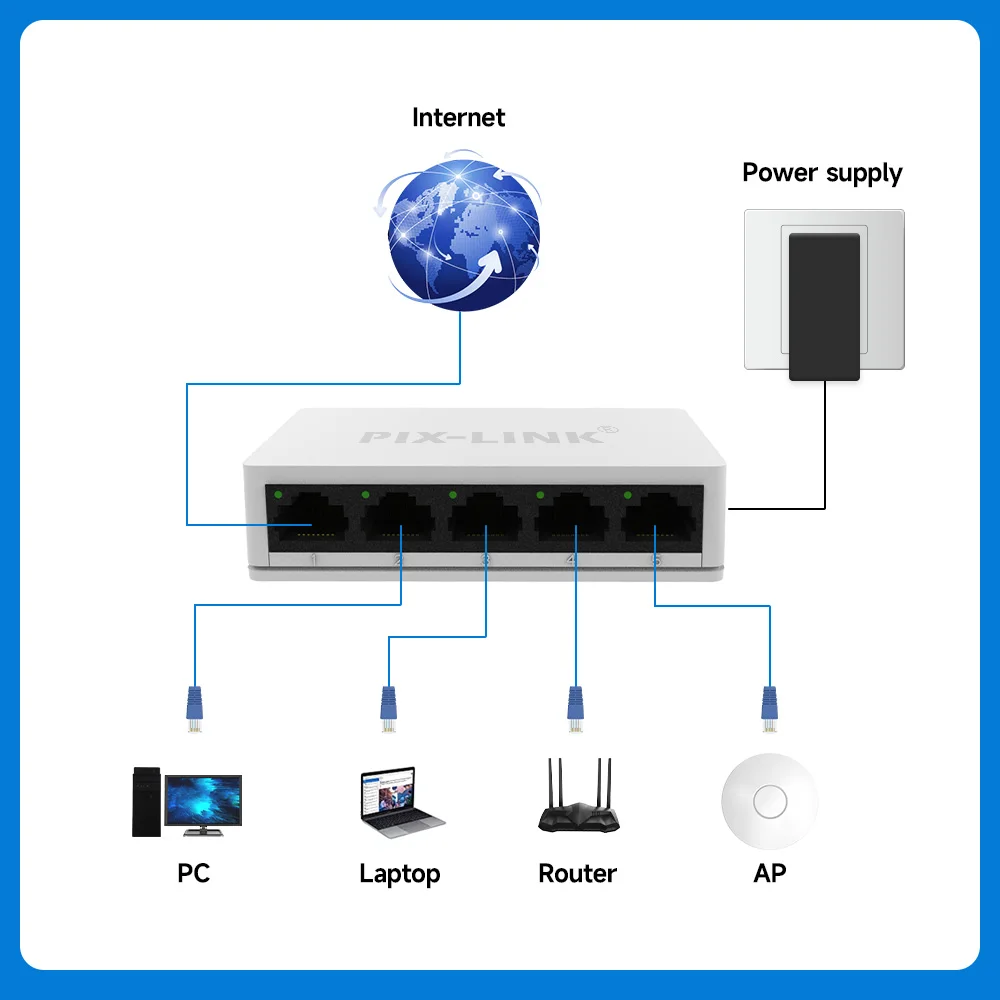 Comprar Conmutadores de red PIX-LINK SW05 5V Mini Ethernet 5 puertos 10/100Mbps solución de expansión de red cable rápida para oficina en casa sin LED