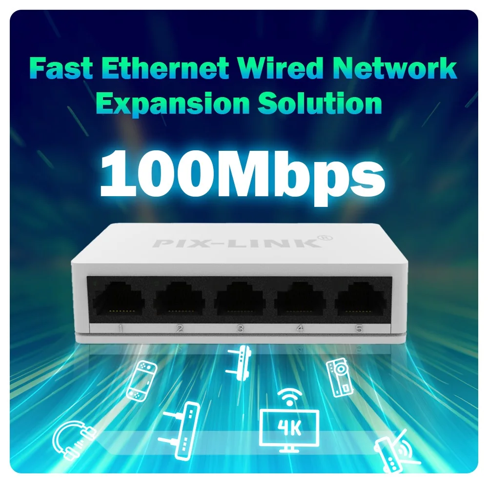 Comprar Conmutadores de red PIX-LINK SW05 5V Mini Ethernet 5 puertos 10/100Mbps solución de expansión de red cable rápida para oficina en casa sin LED