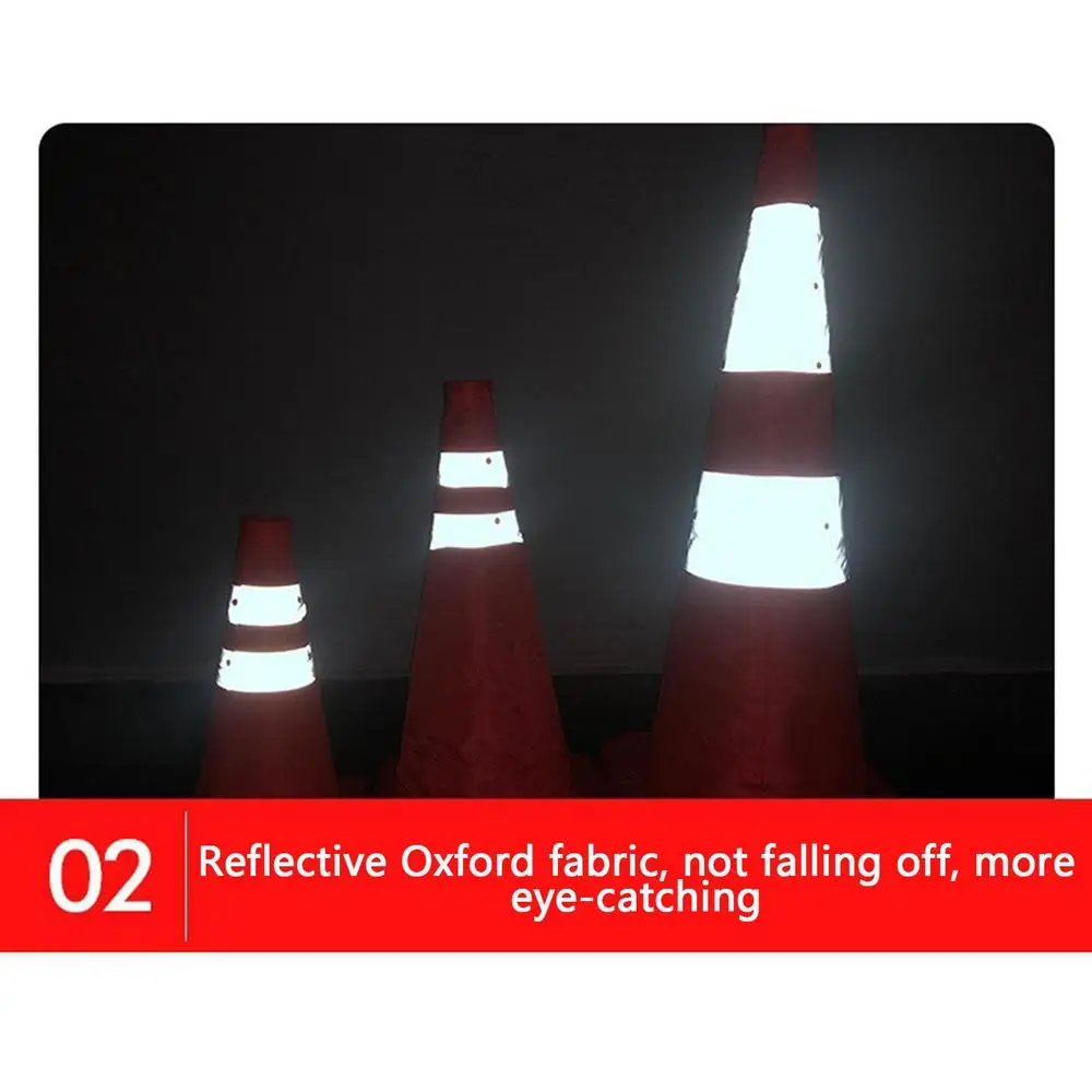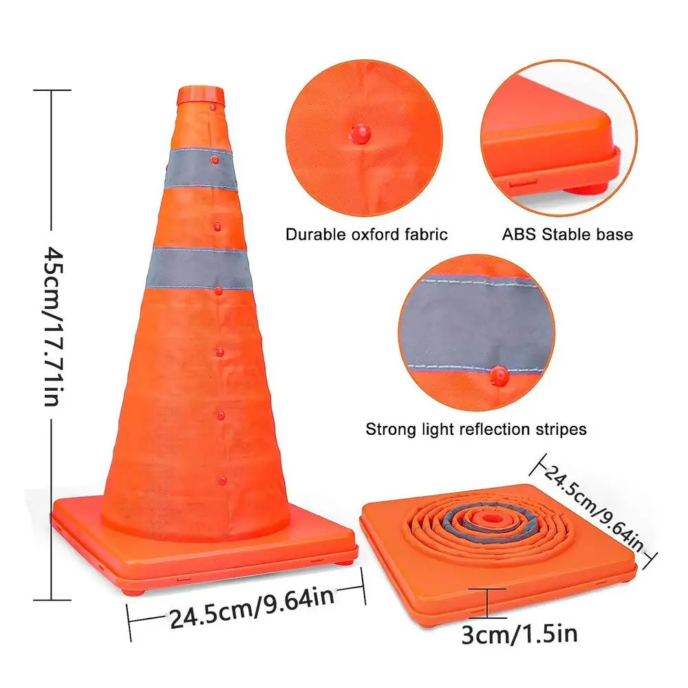 Description:These collapsible road cones feature gray reflective stripes and a vivid orange color that helps them stand out in low light conditions, improving the visibility for drivers and pedestrians in harsh weather.