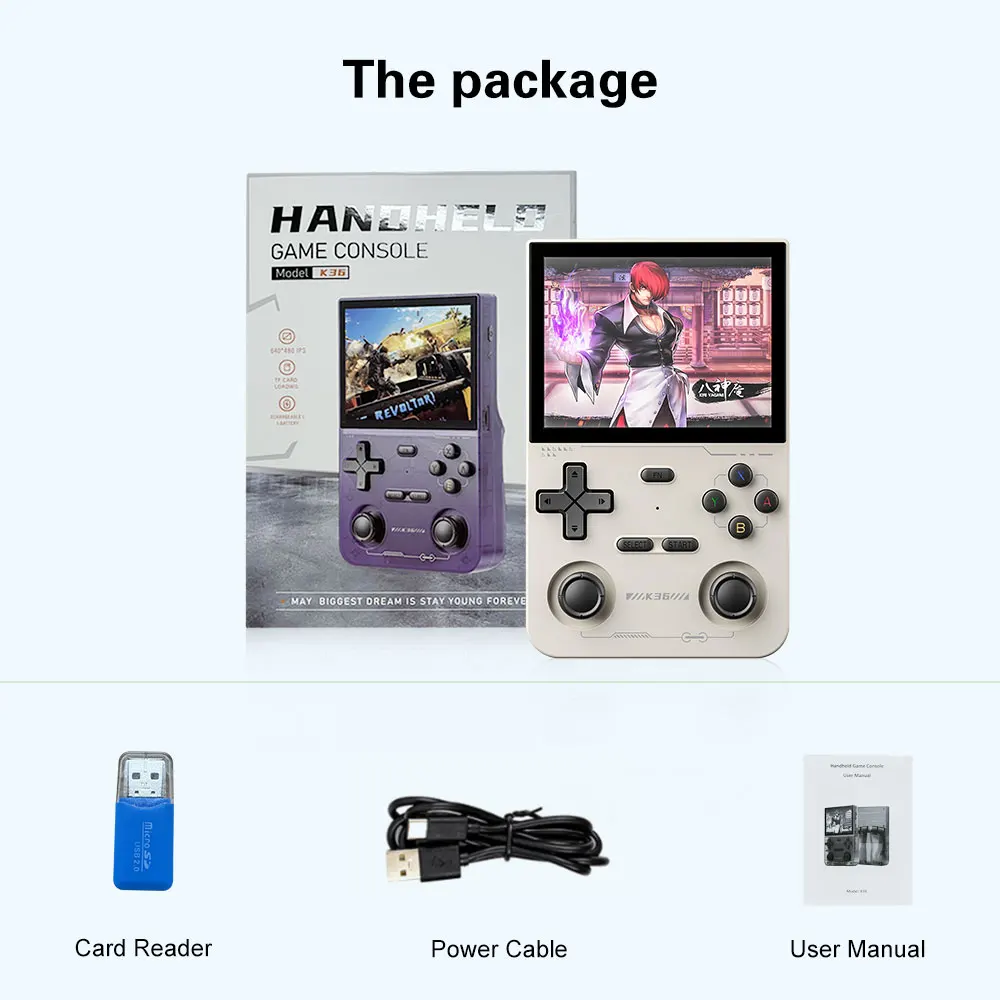 Comprar Consola de juegos K36 RK3326-Linux OS compatible con pantalla IPS de 3,5 pulgadas 640*480 tarjeta TF de 64GB batería recargable L1- 16000 + juegos R36S