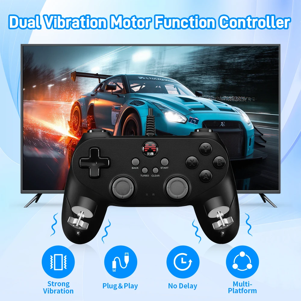 Experimente una respuesta realista con motores de vibración duales, configuración plug-and-play perfecta y retardo de entrada cero.Diseñado para compatibilidad multiplataforma, este controlador también cuenta con funciones personalizables TURBO, BACK, START y CLEAR para un mejor control del juego.