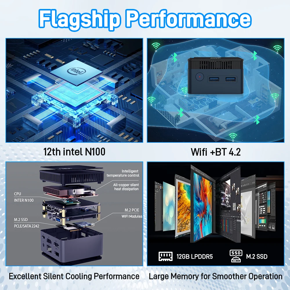 Rendimiento insignia: Impulsado por la CPU Intel N100 de 12.a generación, que ofrece un procesamiento eficiente y capaz.