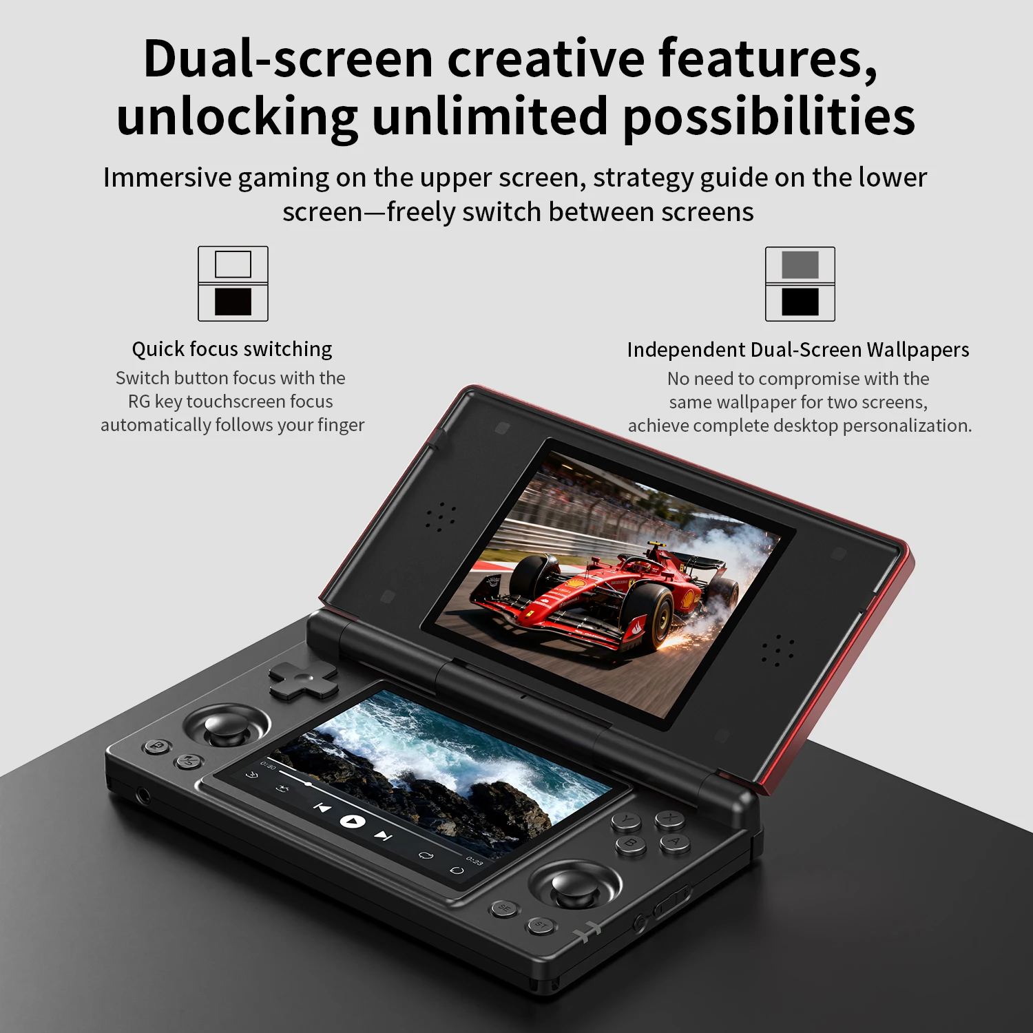 RG DS es la primera consola de juegos abatible de doble pantalla ANBERNIC.Está equipado con un procesador Cortex-A55 de 64 bits de cuatro núcleos RK3568 y es compatible con el sistema Android 14.Tiene una apariencia hermosa y es la consola de juegos portátil preferida para entretenerse en cualquier momento y en cualquier lugar.También es un regalo exquisito para Navidad. Hay tres colores para elegir: negro y rojo carmesí, azul turquesa y blanco polar.¿Qué color prefieres?