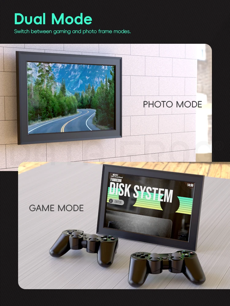Cambie sin esfuerzo entre el modo de consola de juegos y el modo de marco de fotos digital, ofreciendo capacidades de entretenimiento y visualización de fotografías en un solo dispositivo.