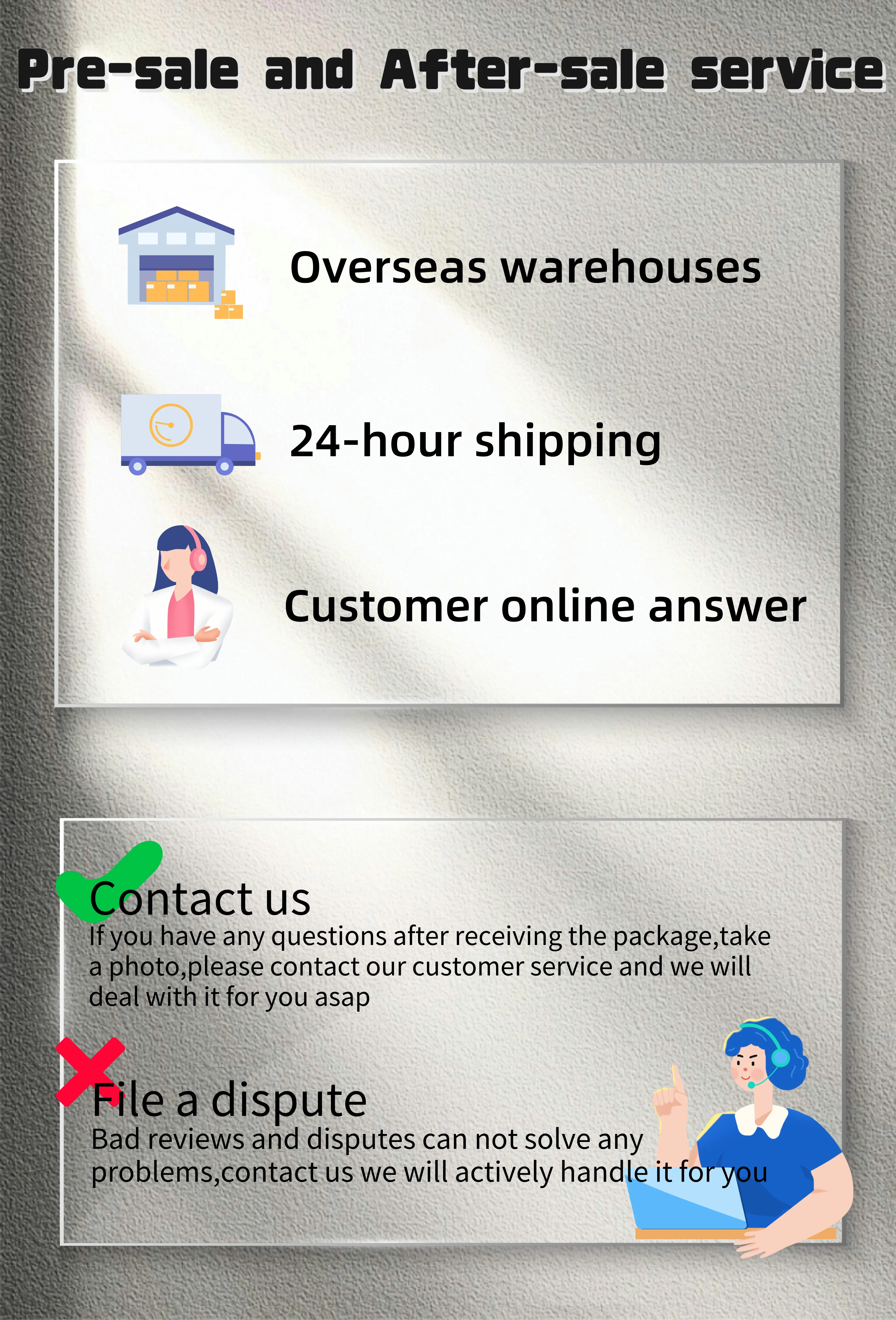 2Si tiene algún problema con nuestros productos o servicios, no dude en contactarnos primero antes de dejar un comentario negativo. Haremos todo lo posible para resolver cualquier problema y brindarle el mejor servicio al cliente.