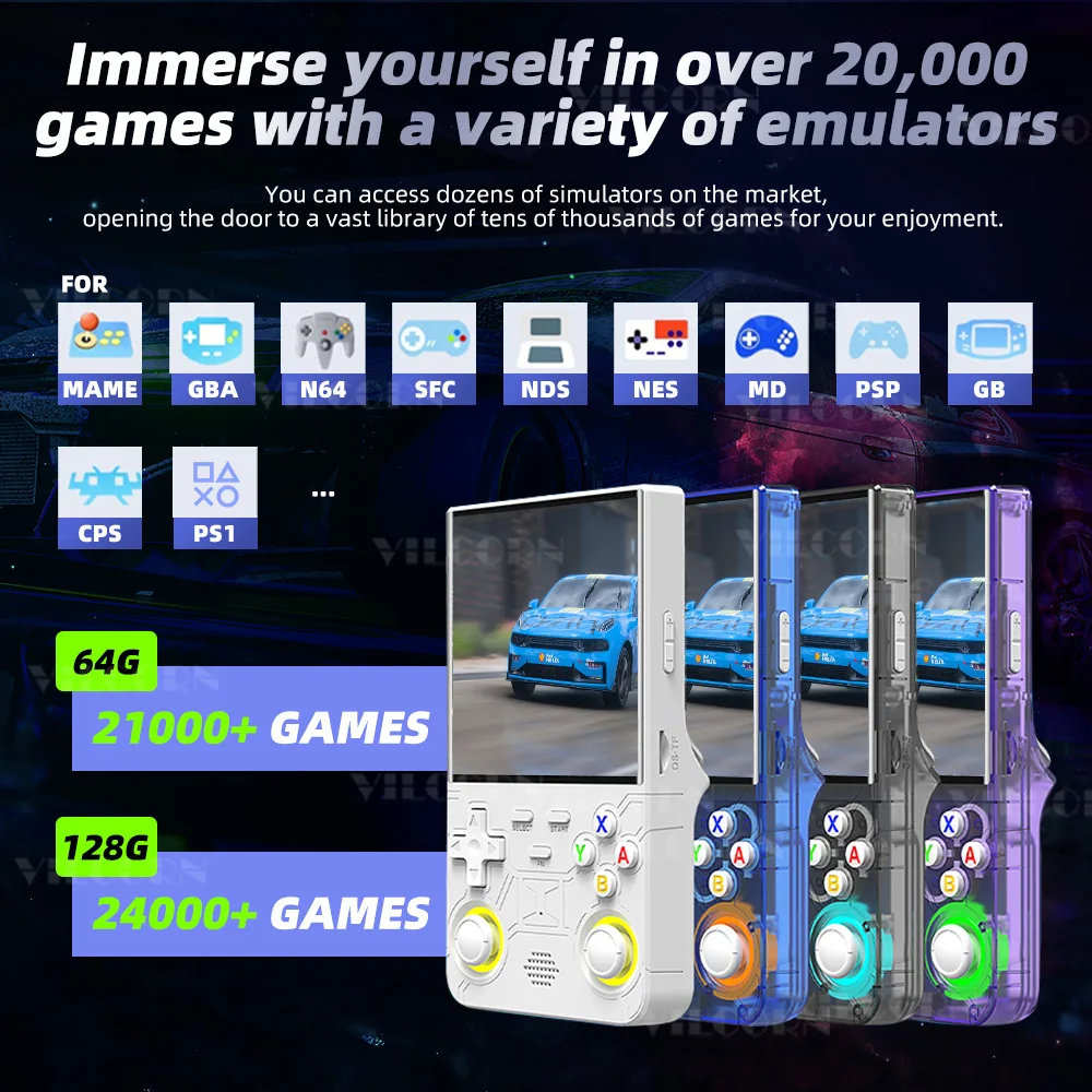 ¡Sumérgete en el cielo de los juegos!Esta consola portátil admite MAME, GBA, PSP y más emuladores.Con más de 64G (21.000 juegos) o 128G (más de 14000 juegos), revive títulos clásicos en cualquier lugar.¡Juego!