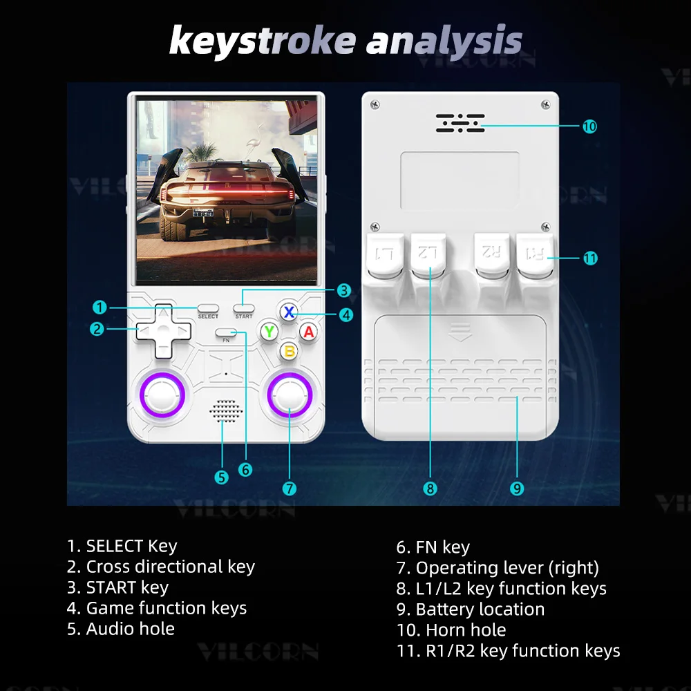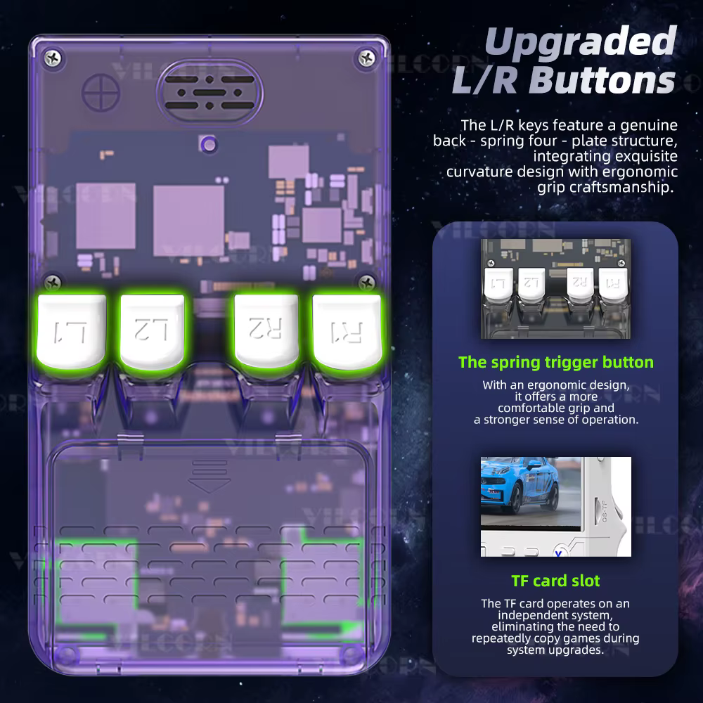 ¡Mejora tu juego!Nuestra consola portátil cuenta con botones L/R mejorados con una estructura trasera de cuatro placas con resorte para mayor comodidad.Además, una ranura para tarjetas TF para más juegos.¡Precisión y comodidad en uno!