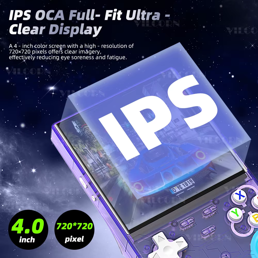 ¡Mejora tu juego!Nuestra consola de juegos portátil tiene una pantalla ultra clara IPS OCA de ajuste completo de 4 pulgadas (720 × 720 píxeles).Imágenes nítidas, menos fatiga visual.¡Juego!