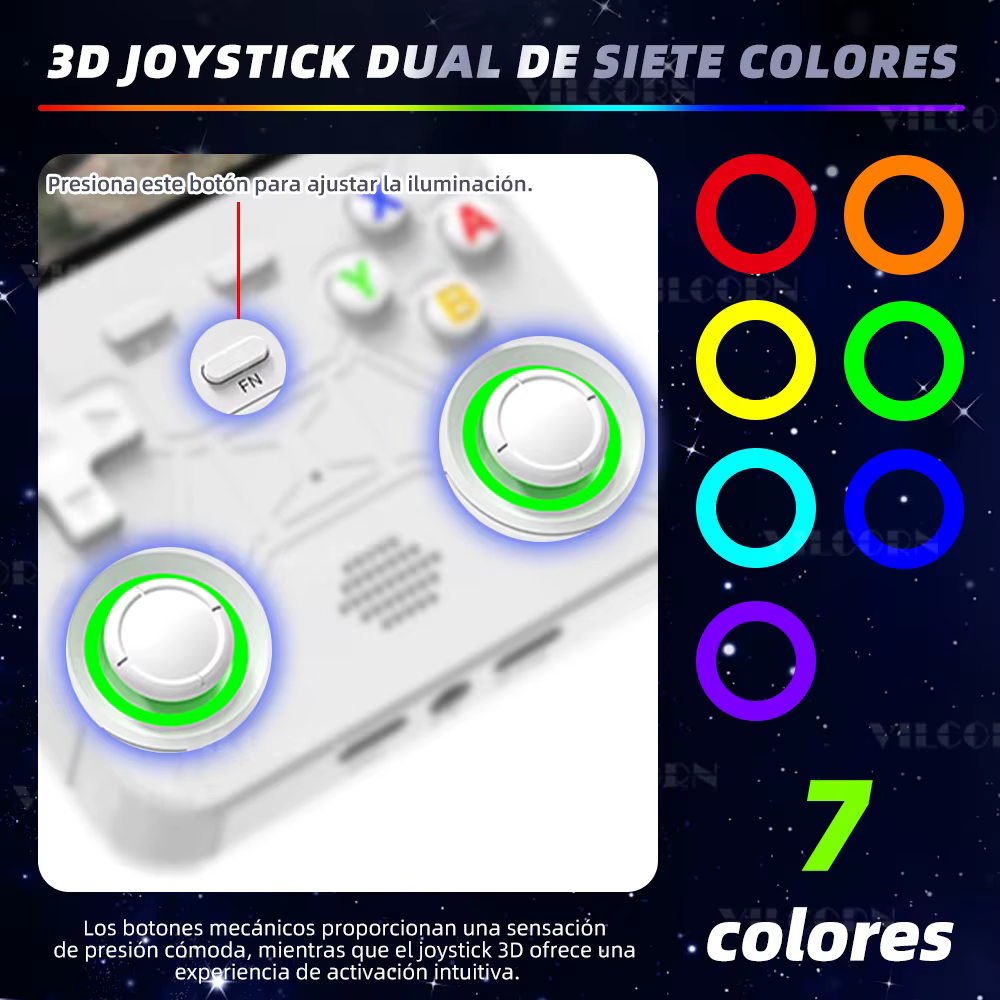 ¡Mejora tu juego con nuestro dispositivo portátil!Tiene joysticks dobles 3D de siete colores.Presione FN para alternar las luces RGB.Los tonos vibrantes aumentan la diversión y hacen de cada sesión de juego un placer visual.¡Juego con estilo!