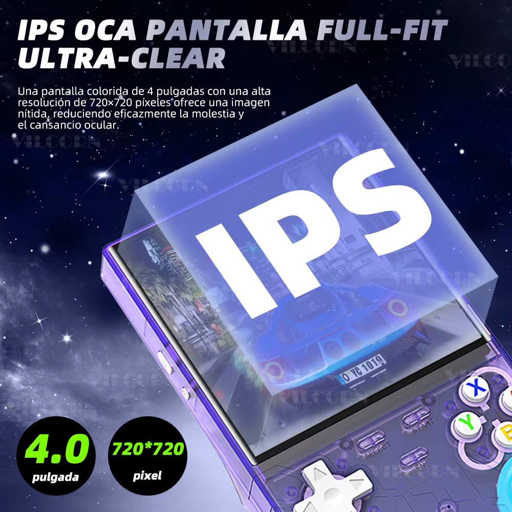 ¡Mejora tu juego!Nuestra consola de juegos portátil tiene una pantalla ultra clara IPS OCA de ajuste completo de 4 pulgadas (720 × 720 píxeles).Imágenes nítidas, menos fatiga visual.¡Juego!