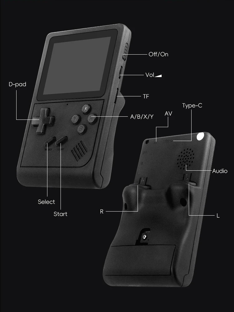 Esta consola de juegos portátil es compatible con GB/GBA/GBC/FC/SFC/MD/PCE que cubre muchos tipos de juegos, como aventura, acción, carreras, etc. Más de 6000 juegos son de los que se pueden seguir los tutoriales en vídeo proporcionados por nosotros y jugar a los juegos por sí mismos.
