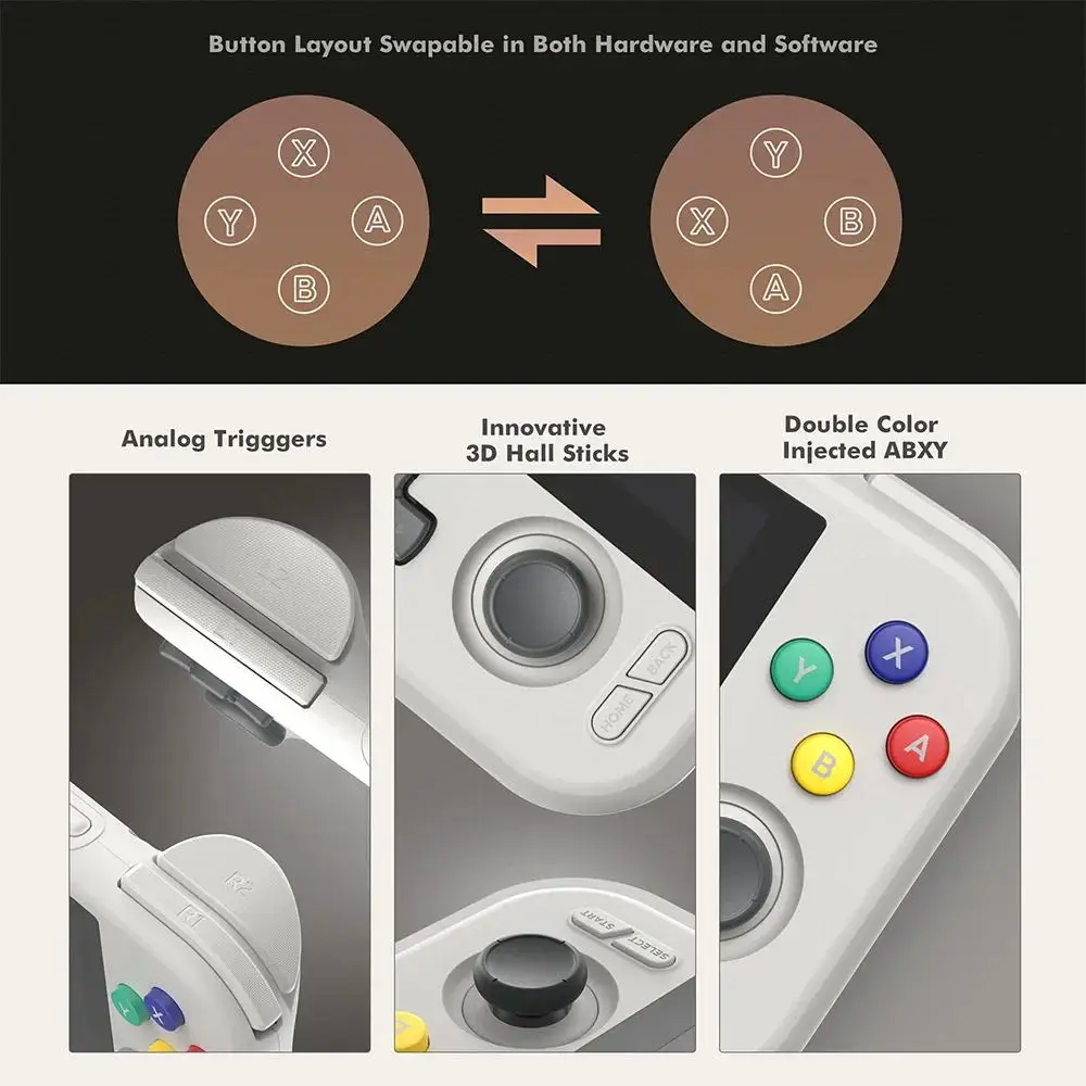 ¡Realmente satisfecho con el producto! Buena relación calidad-precio también. Se siente premium tanto en la mano como en los controles. Básicamente, un dispositivo de juego Android altamente personalizable. Lo suficientemente potente como para jugar PS2, GamCube, Switch y muchos más. Viene con un protector de pantalla y un cable de carga USB C a USB. Tenga en cuenta que debe comprar su propia tarjeta SD y configurar la consola portátil usted mismo. Es el mejor dispositivo para gaming en su rango de precio, en mi opinión.