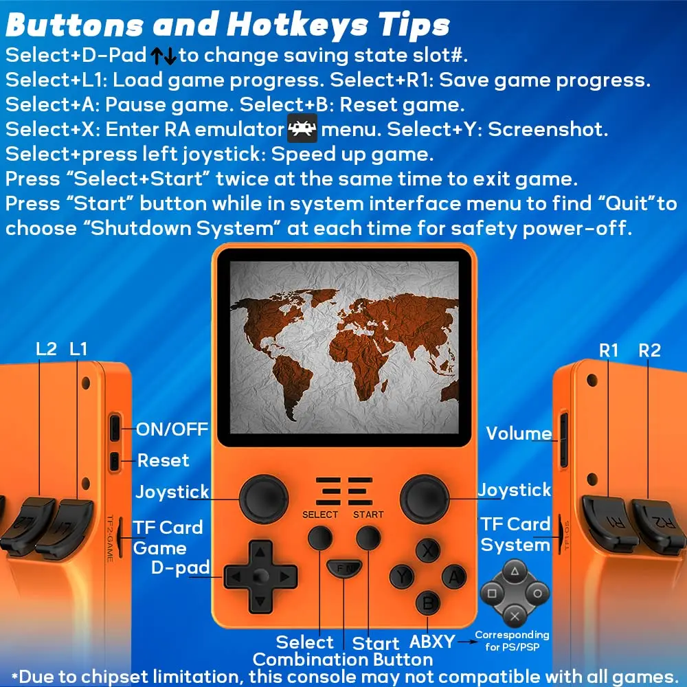 La potente potencia de cálculo, la velocidad de procesamiento más rápida y la mayor calidad de imagen de alta definición del chip de alto rendimiento permiten al host ejecutar la mayoría de los juegos e incluso juegos en 3D sin problemas, reduciendo los retrasos. Puede jugar a juegos de PSP como Dynasty Warriors. Exclusivo sistema ArkOS Linux, configuración predeterminada en inglés y funciones de guardar y cargar, no más datos perdidos y comenzar de nuevo, brindándole una excelente experiencia de juego.