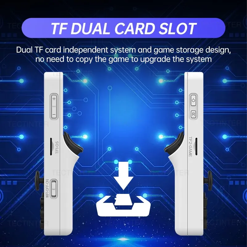 Sistema independiente de tarjeta TF dual y diseño de almacenamiento de juegos, no es necesario copiar el juego para actualizar el sistema. Soporte máximo para expansión de tarjeta de sistema 256G. Memoria incorporada de 16G, equipada con tarjeta de juego de memoria de 32GB/64GB/128GB/256GB.