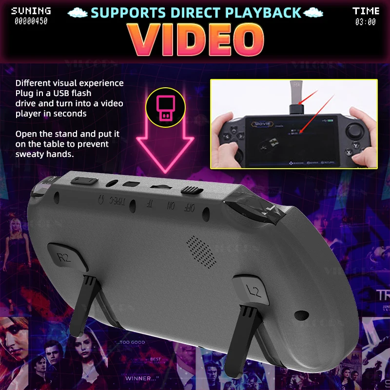 Esta consola portátil está diseñada pensando en la comodidad.Cuenta con un soporte en la parte posterior.Ahora puedes sostenerlo y disfrutar de tus juegos o ver vídeos con manos libres.Ya sea en una mesa o escritorio, ofrece una experiencia de visualización estable y cómoda.