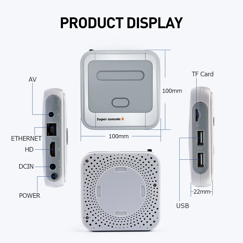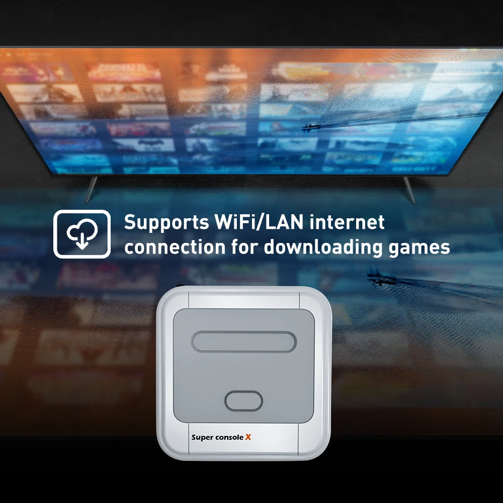 La consola de juegos Super Console X admite pantalla HD 720/1080p compatible con HDMI, puede ser compatible con dispositivos de entrada HD, como proyectores, televisores, monitores, etc., y puede jugar a tiempo sin TV