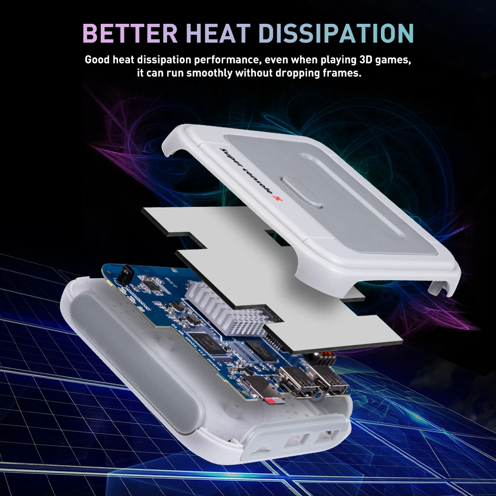 Super Console X agrega una pieza entera de hierro de disipación de calor sobre la base de la disipación de calor original, que puede disipar rápidamente el calor y jugar sin problemas sin reducir la frecuencia.