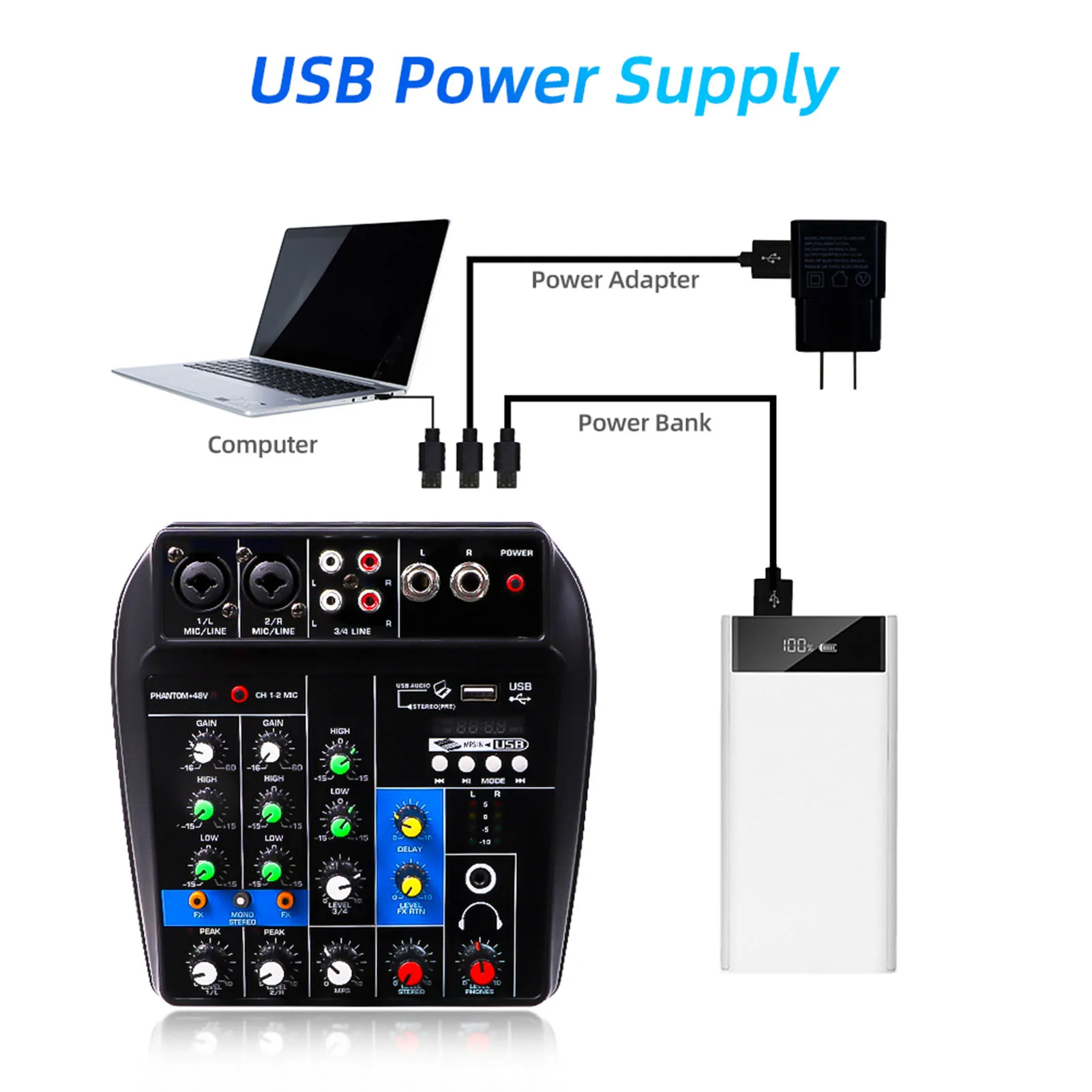 Operación simple: funciona con la computadora, fácil de operar, fácil de procesar audio. Adecuado para reproductores de CD, órganos electrónicos, micrófonos de condensador, instrumentos musicales, micrófonos, altavoces, etc.