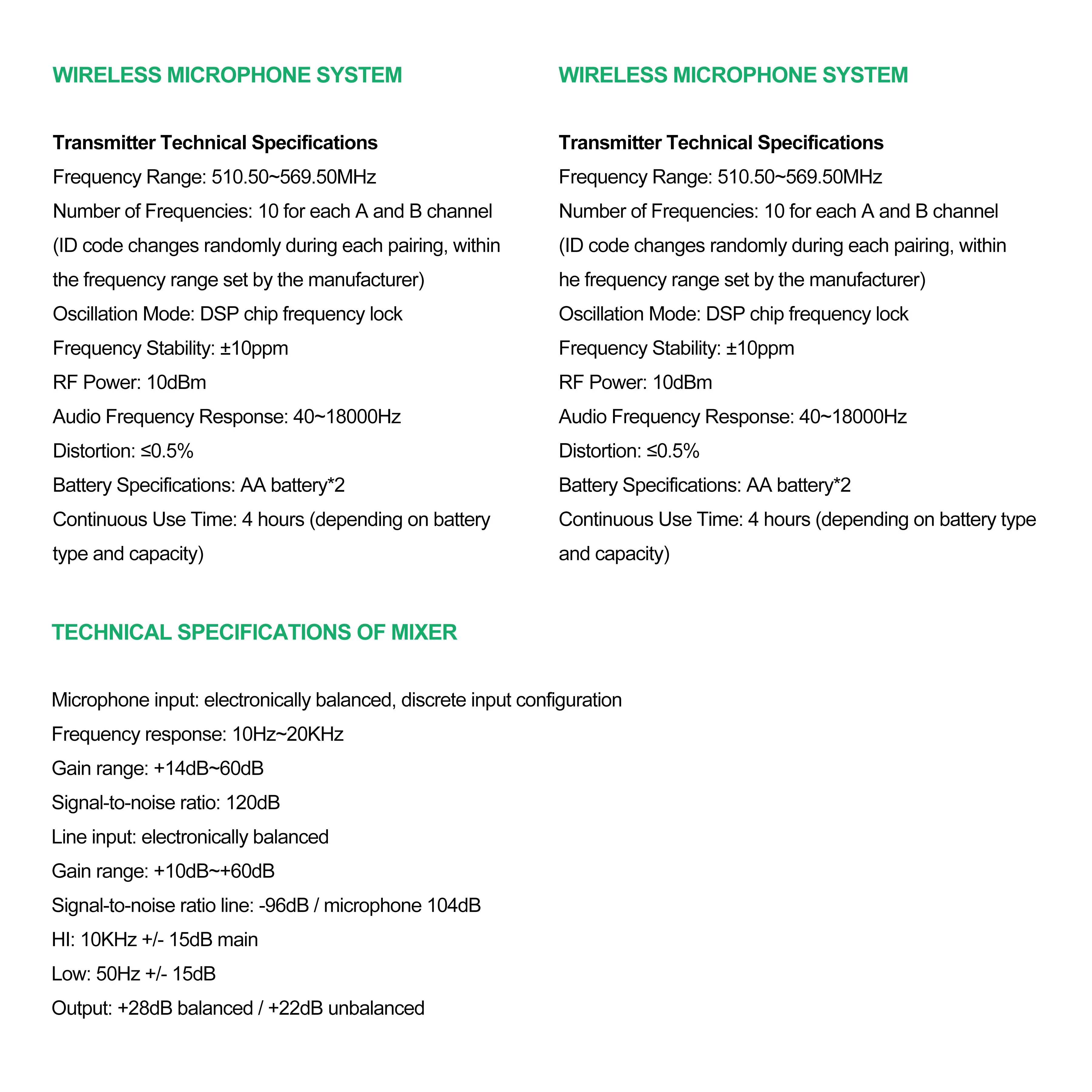 Número de frecuencias: 10 para cada canal A y B (el código de identificación cambia aleatoriamente durante cada emparejamiento, dentro del rango de frecuencia establecido por el fabricante)