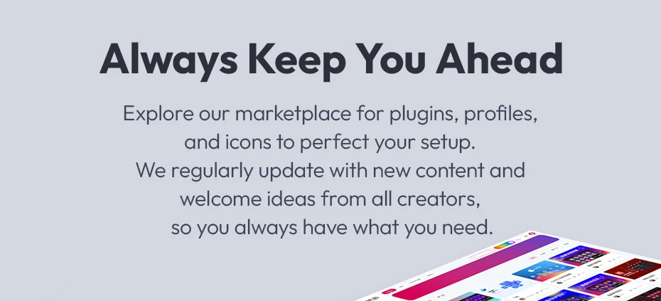Explore nuestro mercado de complementos, perfiles e íconos para perfeccionar su configuración.Actualizamos periódicamente con nuevos contenidos y damos la bienvenida a ideas de todos los creadores, para que siempre tengas lo que necesitas.