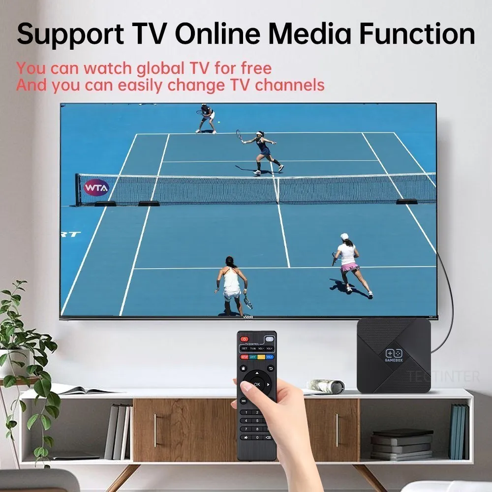 Consola de videojuegos preinstalada con más de 40000 juegos de TV integrados, que se puede jugar como se quiera sin descargar e instalar. Además, esta súper caja también se puede cambiar al sistema Android TV 7,0, puede descargar la aplicación en este modo, también puede navegar por las noticias y ver vídeos en el televisor.