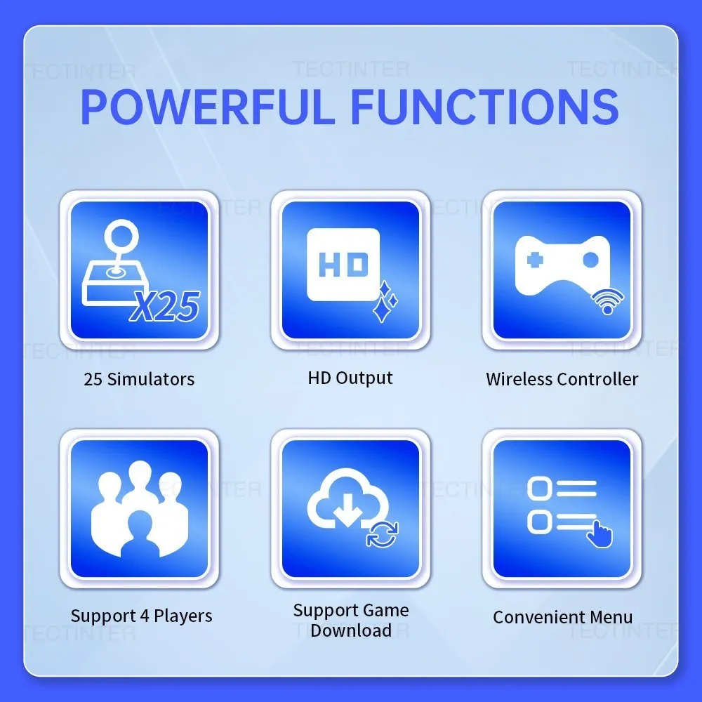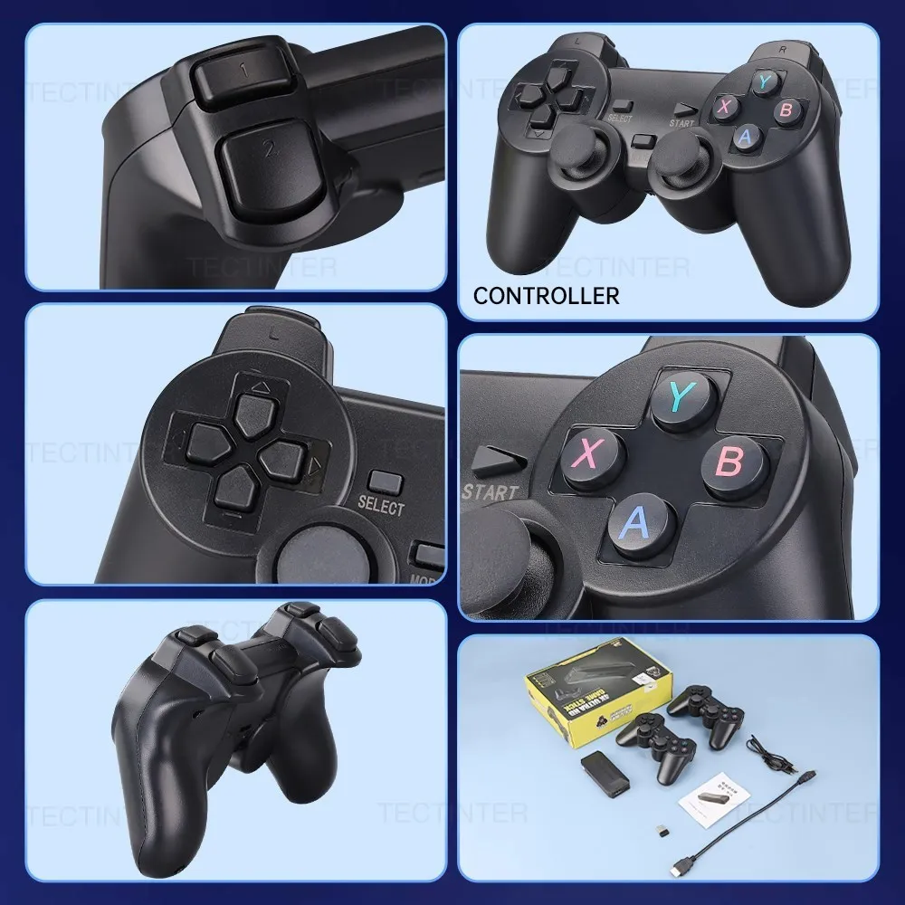 La última consola de juegos de TV inalámbrica, con tarjeta de memoria de 64G, más de 19100 juegos incorporados. Admite 25 tipos de idiomas de operación del sistema como inglés/Corea/ruso/español/portugués/francés, etc.