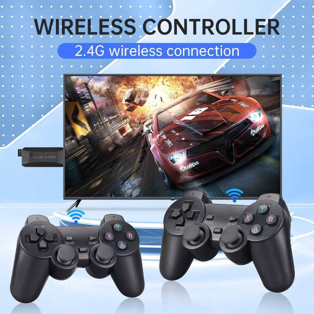Equipado con dos controladores de juegos de TV inalámbricos de 2,4 Ghz. Admite hasta 4 jugadores al mismo tiempo, puede controlar y disfrutar del juego de forma remota en el sofá con su familia o amigos. ¡Tanto el controlador inalámbrico como el controlador con cable son compatibles! (Aviso, nuestro producto solo incluye 2 piezas de controladores inalámbricos)