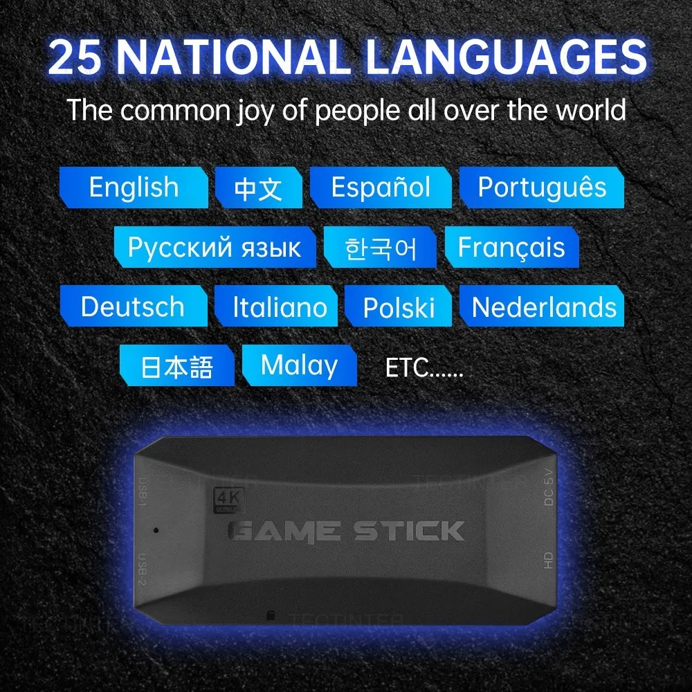 La última consola de juegos de TV inalámbrica, con tarjeta de memoria de 64G, más de 19100 juegos incorporados. Admite 25 tipos de idiomas de operación del sistema como inglés/Corea/ruso/español/portugués/francés, etc.