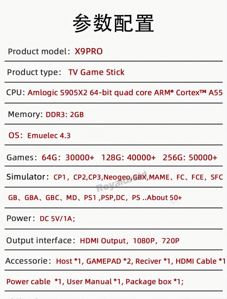128G 256G X9 PRO GameStick 4KHD TV consola de videojuegos juegos 3D para PSP/PS1/N64/NDS 40 + simuladores juegos Retro Dual 2,4G controladorCaracterísticas:* Nombre: consola de videojuegos X9 PRO**** Admite juegos 3D más grandes.* Función: con función de búsqueda, función de colección, función de guardar el progreso del juego* Salida HD compatible con 4KHD,* Controlador inalámbrico: Controlador inalámbrico 2,4G compatible con 1-2 jugadores, deshazte de la limitación del cable y juega libremente* Soporta más de 40 Simuladores*Dispositivos compatibles: TV, proyector, ordenador (se requiere dispositivo de captura de vídeo) *Funciones: Marcador/Guardar progreso/Descargar juegos/Juego para dos jugadoresEspecificación:2024 Nuevo Retro Game Stick 40 + Simulador 37000/42000/50000 + Juegos-Actualización de chip 905X3 Flagship de gama alta