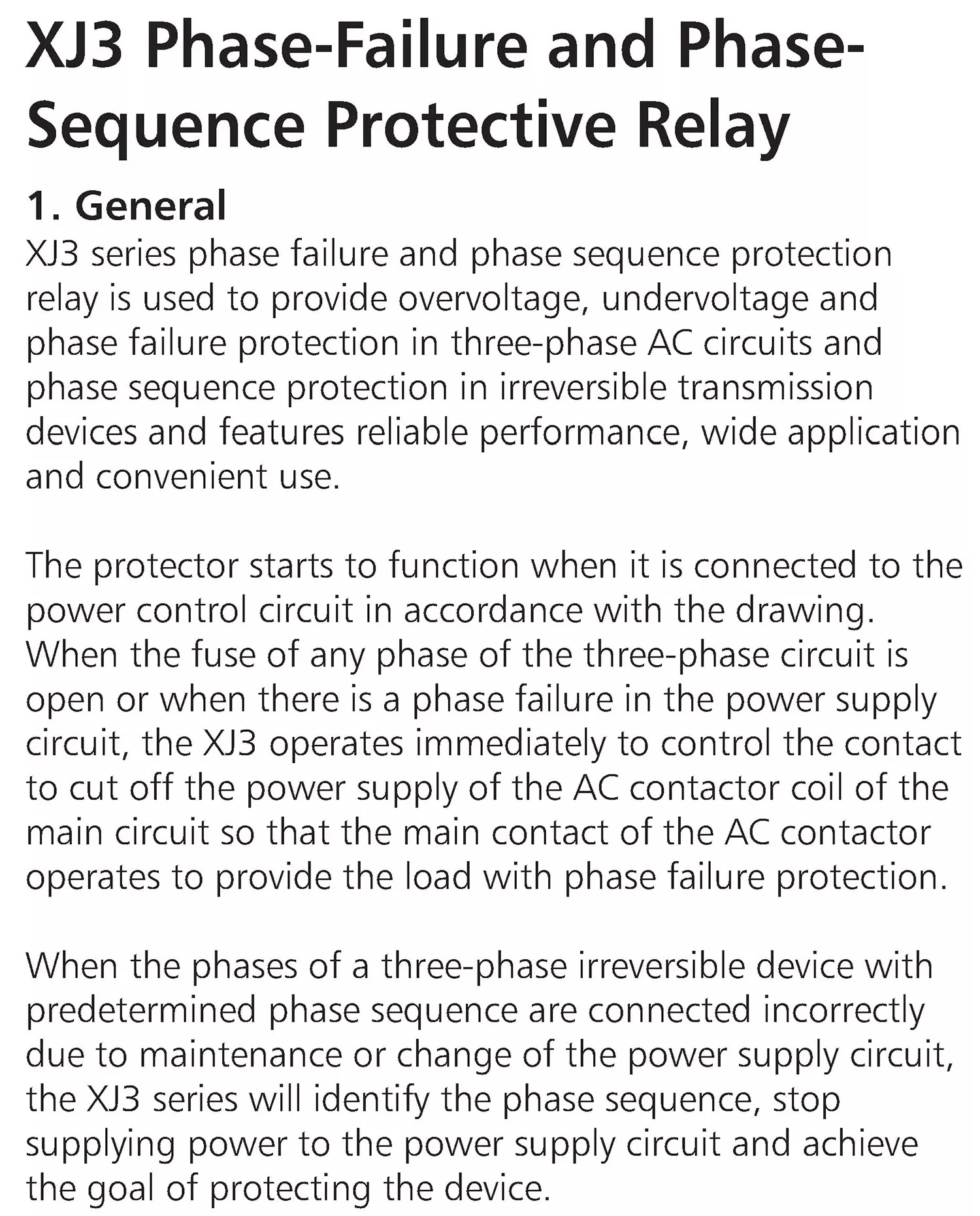 Los relés de protección de secuencia de fase y fallos de fase de la serie XJ3 se utilizan para la protección contra sobretensión y fallas de fase en circuitos de CA trifásicos y protección de secuencia de fases en equipos de transmisión irreversibles.Tiene las características de rendimiento confiable, amplia gama de aplicaciones y uso conveniente.Esta serie de protectores está conectada al circuito de control de potencia según la figura, lo que puede desempeñar un papel protector.Cuando el fusible de cualquier fase en el circuito trifásico está abierto o la línea de alimentación está desconectada, el XJ3 actuará inmediatamente y el contacto de control cortará la bobina del contactor de CA del circuito principal.La fuente de alimentación logra así la acción del contacto principal del contactor de CA y protege la carga de fallas de fase.Cuando el equipo trifásico irreversible está conectado con la secuencia de fases original debido al mantenimiento o modificación de la línea de alimentación después de identificar la secuencia de fases, la serie XJ3 también puede identificar la secuencia de fases y funcionar de manera confiable, detener el suministro de energía al circuito de suministro de energía y lograr el propósito de proteger el equipo.