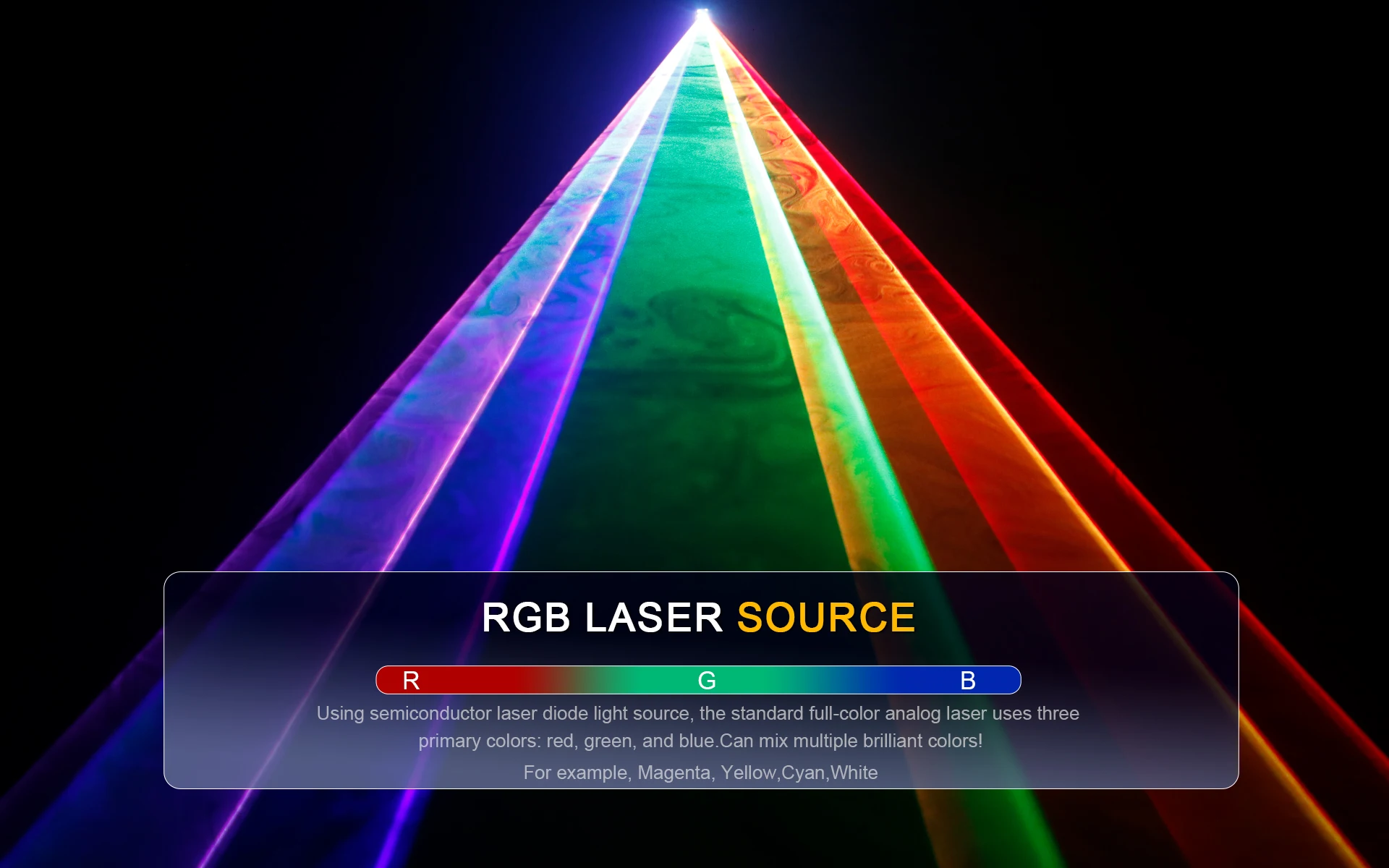 Utilizando una fuente de luz de diodo láser semiconductor, el láser analógico a todo color estándar utiliza tres colores primarios: rojo, verde y azul.