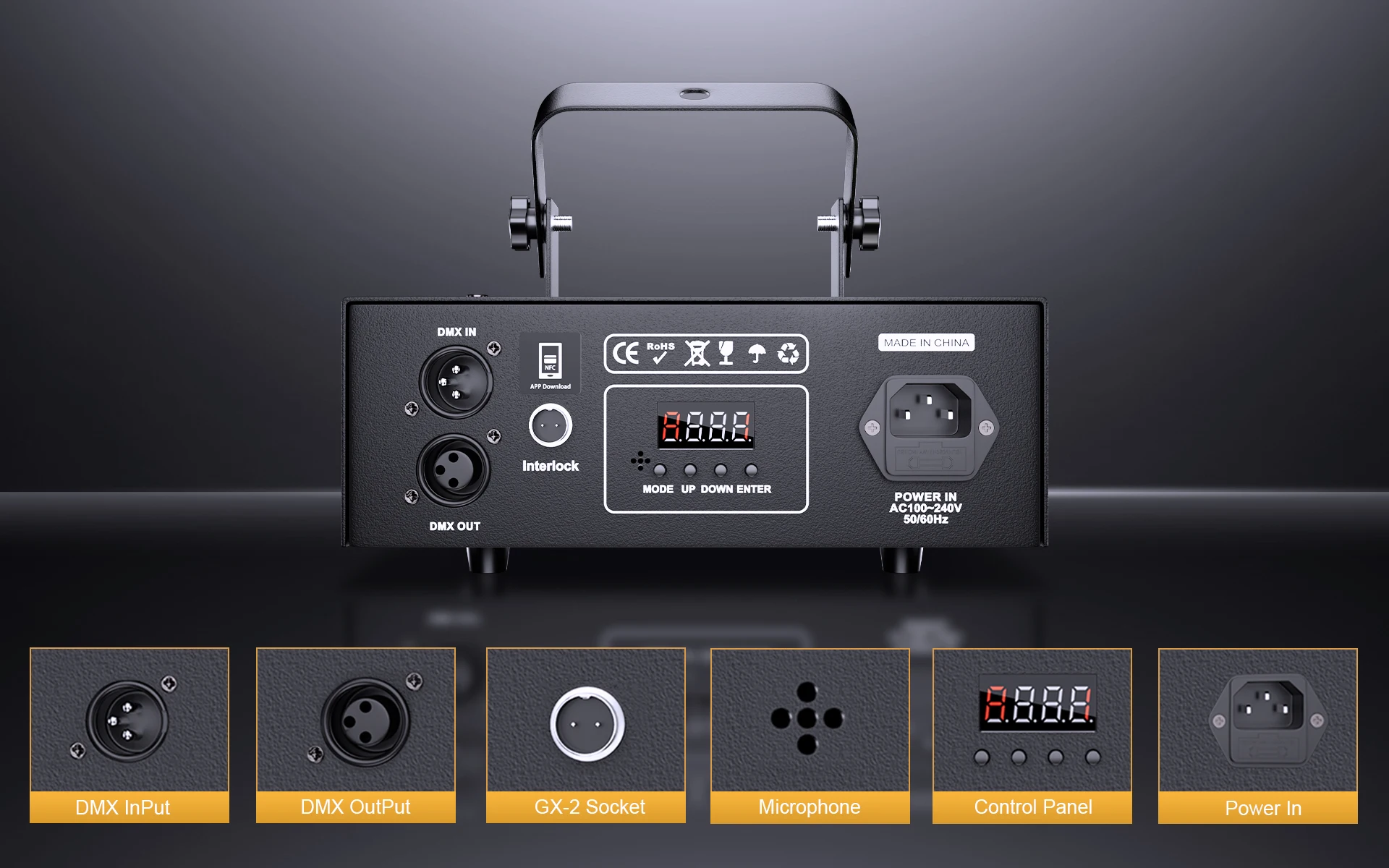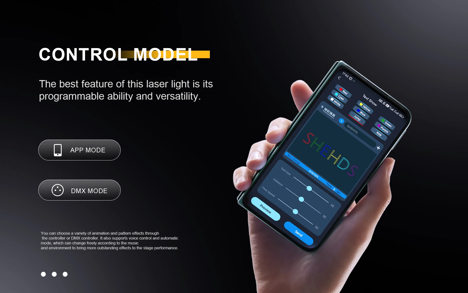 El láser se puede controlar mediante aplicaciones Android y Apple para la mayoría de las funciones, siete sin consola DMX.