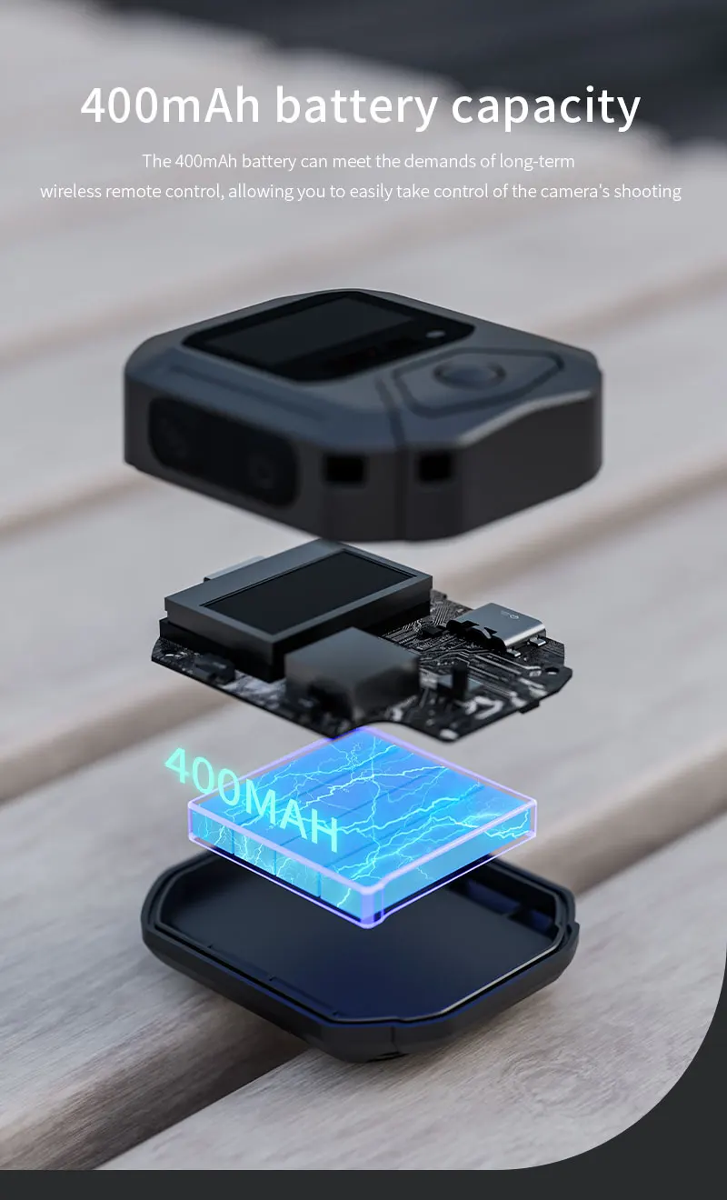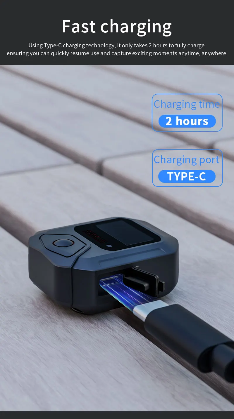 Con un cuerpo miniaturizado de solo 46×40×12,5 mm, es liviano y casi liviano; La tecnología de carga rápida tipo C admite una carga completa en 2 horas, lo que permite disparos al aire libre ininterrumpidos.La pantalla muestra el nivel de la batería, la capacidad de la tarjeta SD y la señal GPS en tiempo real, con controles intuitivos.