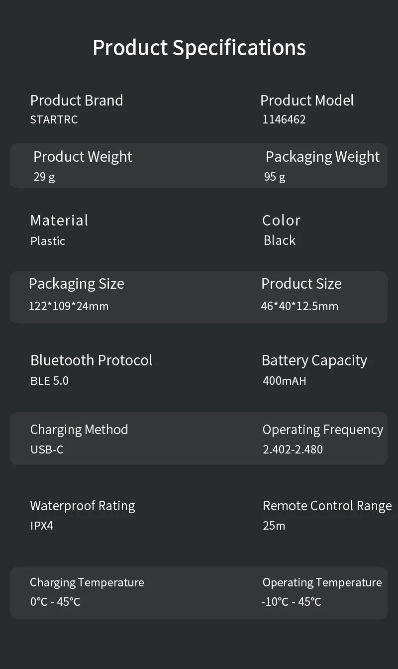 Activación/suspensión con un solo botón para la cámara, cambio rápido de modo y monitoreo del estado del dispositivo en tiempo real;una pulsación breve del botón del obturador comienza a grabar instantáneamente, emparejado con un Bluetooth 5 estable.0 conexión para una respuesta precisa incluso en entornos complejos.