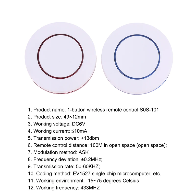 Nuevo y de alta calidad Color: blanco y azul/blanco y rojo Voltaje de funcionamiento: 6V Batería: CR2016X1 (Incluido) Frecuencia de trabajo: 433MHz. Chip de codificación: EV1527 (Código de aprendizaje). Tamaño: 49mm x 12mm. Paquete incluido: 1. Nota: 1. Debido a la medición manual, permita un error de 1-3mm. 2. Como los diferentes ordenadores muestran diferentes colores, gracias por su comprensión, el color real del producto puede ser ligeramente diferente de la imagen.