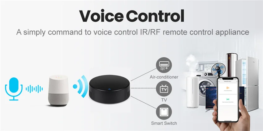 Dígale adiós al uso de controles remotos para cada uno de los electrodomésticos IR como TV, aire acondicionado, caja de TV, luz, ventilador, audio, etc.