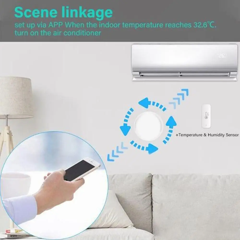 Controle a distancia sus electrodomésticos mediante el uso de la aplicación "Tuya Smart" en su teléfono inteligente en cualquier lugar y en cualquier momento. Por Ejemplo: Encienda el aire acondicionado de casa con anticipación, disfrute de la temperatura agradable una vez que llegue a casa.