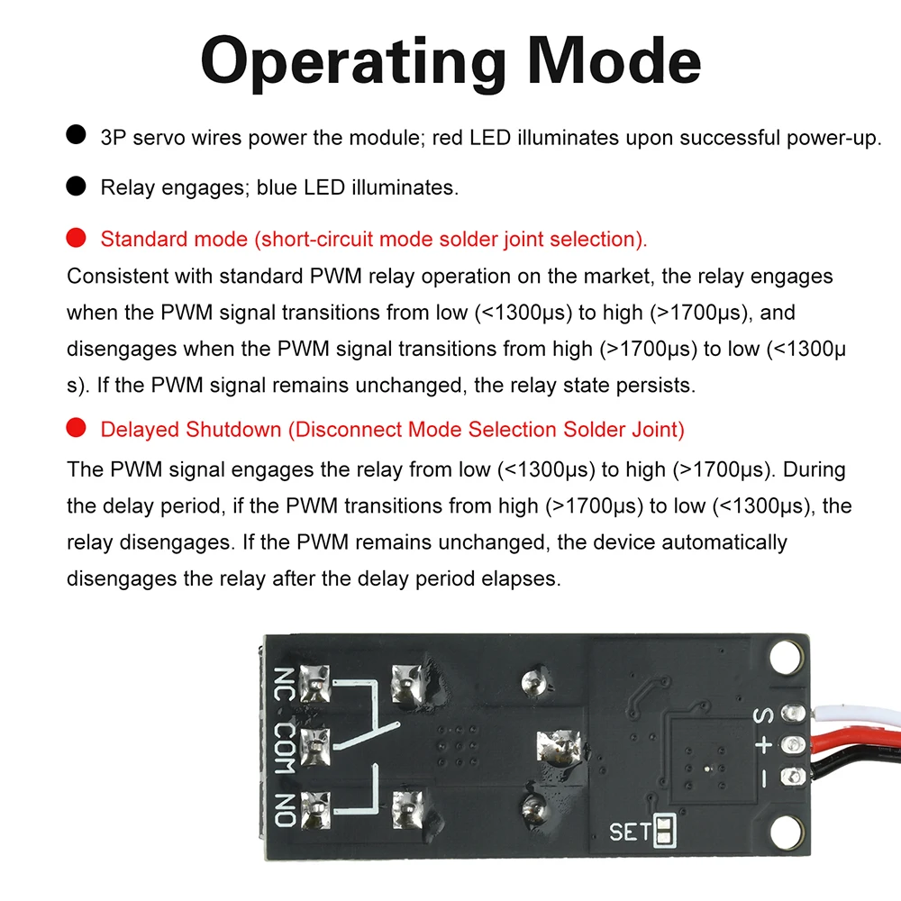Aspectos destacados del producto: 1.Admite entrada de 5-18 V, adaptable a diversas necesidades de equipos modelo. 2.Controla con precisión los interruptores de luz de navegación, asegurando estabilidad y confiabilidad. 3.Duración de retardo personalizable para cumplir con los requisitos de uso en diferentes escenarios. 4.Emplea relés de alta calidad para garantizar un funcionamiento seguro bajo cargas elevadas.