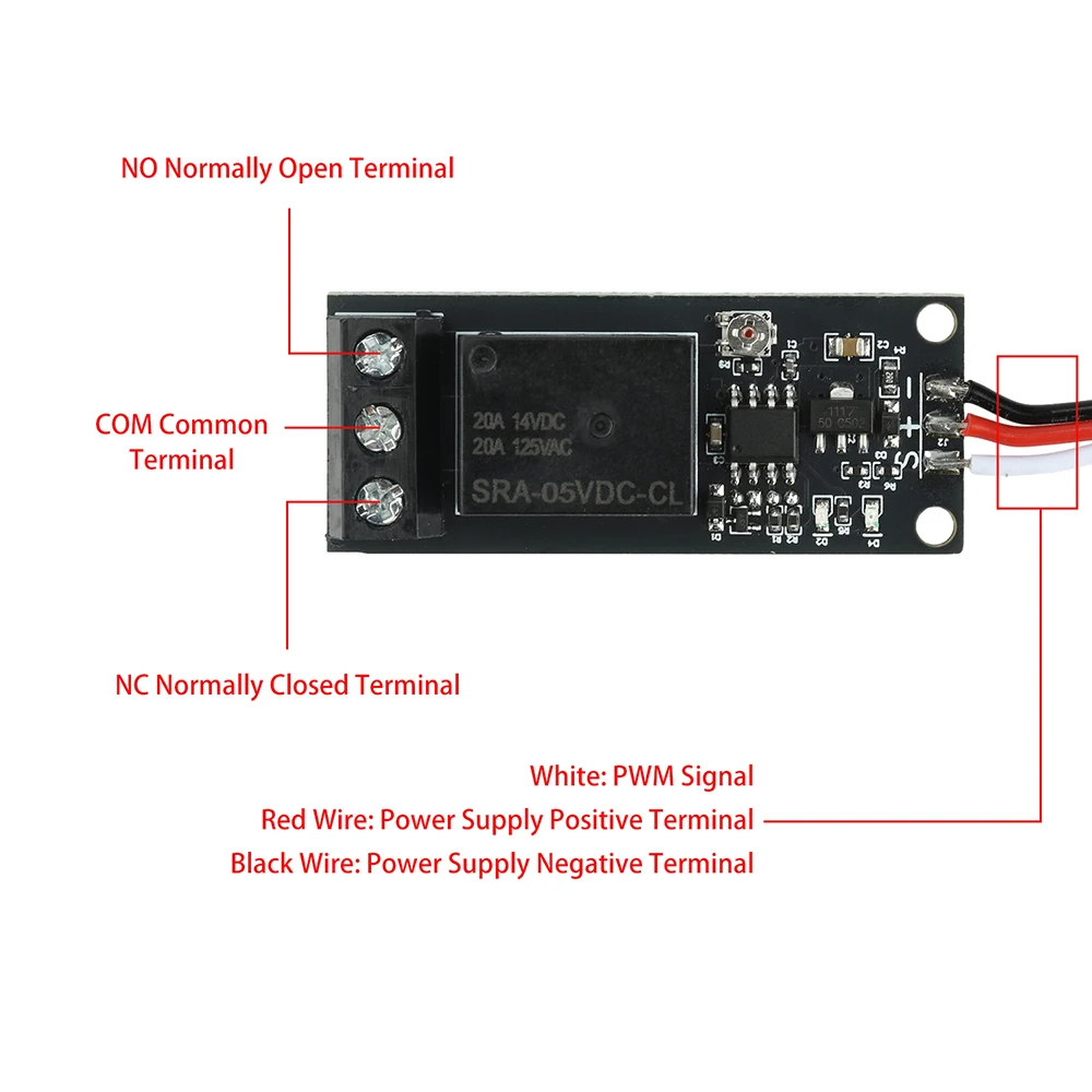 Preguntas frecuentes: 1: ¿El interruptor tiene una salida? R: Sin salida, es solo un interruptor unipolar de doble tiro.El dispositivo se alimenta por separado; el voltaje de salida es el mismo que el voltaje de la fuente de alimentación. 2: ¿Cuál es la diferencia entre un interruptor electrónico y un relé? R: Ambos son interruptores, pero los relés admiten una corriente más alta (máximo 20 A).Los relés pueden usar CA o CC, mientras que los interruptores electrónicos solo pueden usar CC. 3: ¿El interruptor está controlado por el ciclo de trabajo PWM? R: PWM se refiere al ciclo de trabajo.Utilizando el control PWM en modelos de aviones, el período es de 20 milisegundos, con un nivel alto de 1 a 2 milisegundos.
